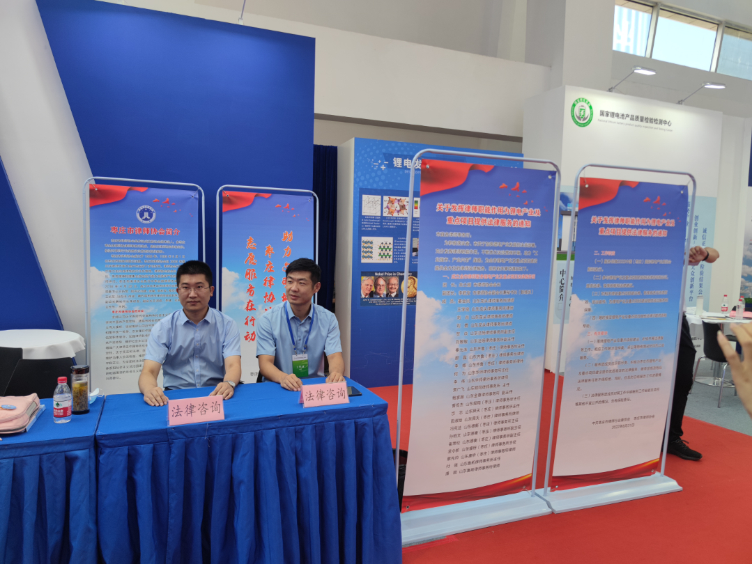 2022中国(枣庄)国际锂电产业展览会期间,枣庄市律师协会积极参与锂电产业及重点项目的现场法律咨询和论证,提供法律、政策依据和法律建议,对相关锂电重点项目建设者、管理者进行法律质效、法治宣传,为锂电产业及重点项目建设提供法治服务和保障。